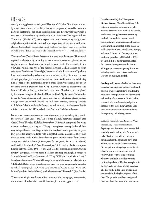 This series was compiled to correlate loosely with the Modern Course method and can be used to supplement any teaching method or situation. This volume features a mix of well-known pieces such as Petzold's ?Minuet in G Major? from the Anna Magdelena Notebook, Schumann's ?Soldier's March,? and Beethoven's ?Ecossaise in G Major? as well as lesser-known gems like d'Indy's modern ?Three-Finger Partita? and Rebikov's ominous ?Limping Witch Lurking in the Woods.?