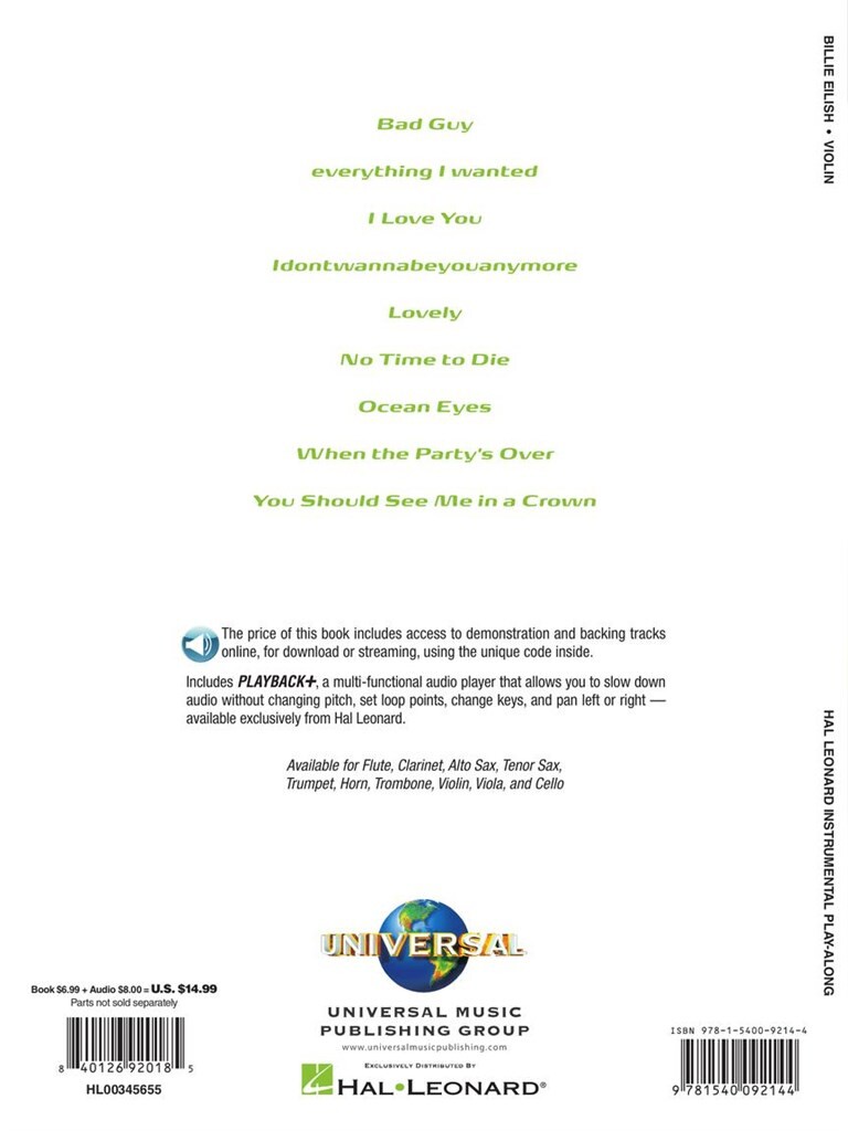 Algunos de los mayores éxitos de Billie Eilish están disponibles para ser tocados por una variedad de instrumentistas. Todas las ediciones incluyen: Bad Guy Lovely - Everything I Wanted - No Time to Die - Ocean Eyes y más. Arreglos instrumentales solistas para instrumentos de cuerda y viento con acompañamiento de audio para 9 de los mayores éxitos de Billie Eilish.