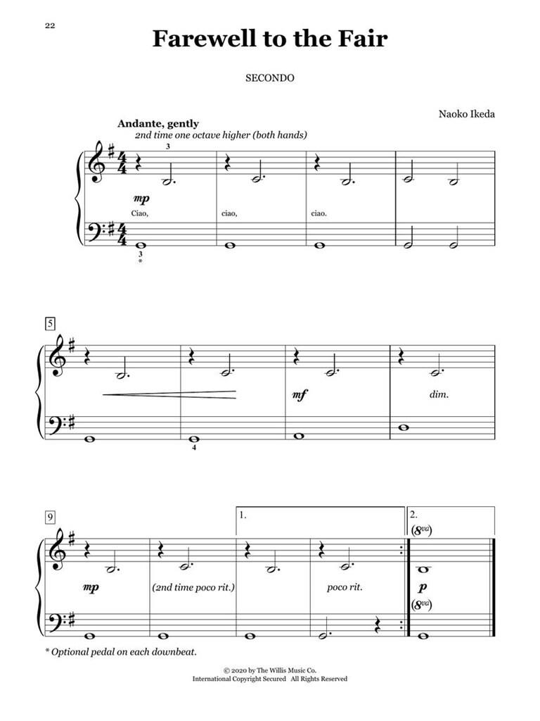 7 equal-level duets that will delight young pianists! Titles: Bumper Car Joy · Farewell to the Fair · Ice Cream Time · The Jokey Juggler · Little Flamenco Dancer · The Pegasus on the Carousel · Story of a Star.